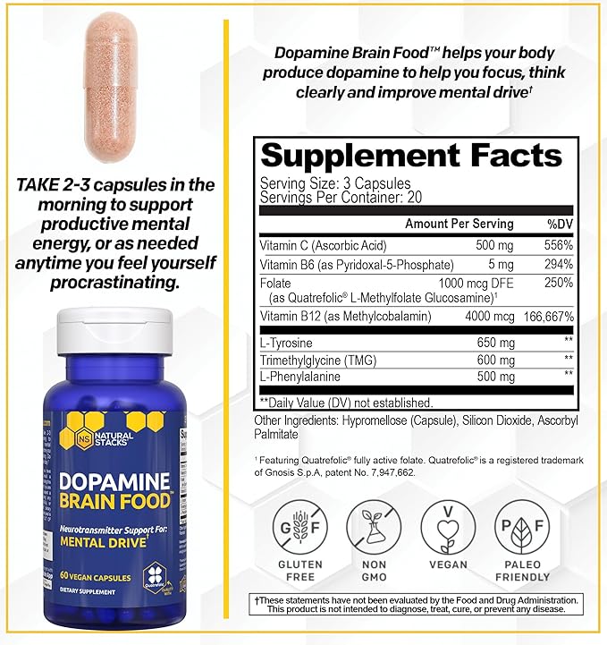 Dopamine Brain Food - 650mg L-Tyrosine Supplement - Dopamine Supplement for Focus & Mental Drive - Supports Mental Energy - Neurotransmitter Support with B Vitamins - 60 Capsules