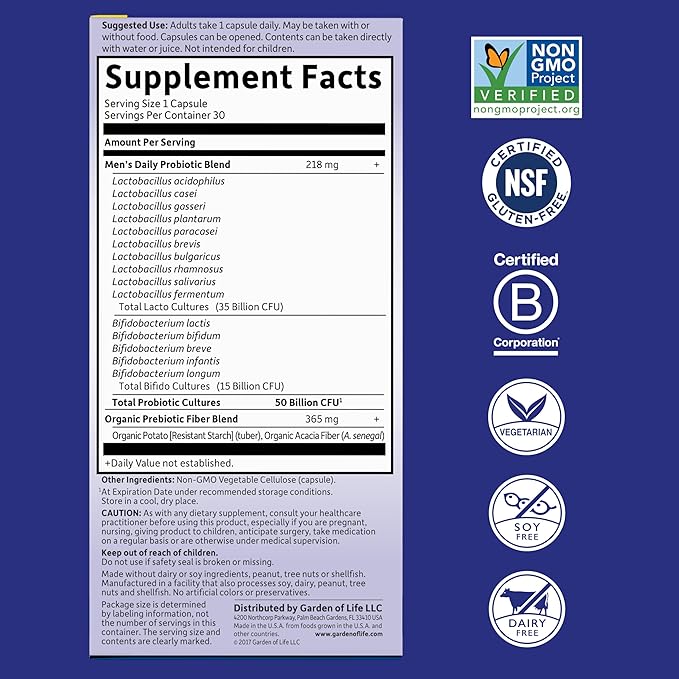 Garden of Life Probiotics for Men, Dr Formulated 50 Billion CFU 15 Probiotics for Digestive Health + Organic Prebiotic Fiber, Colon & Immune Support, Daily Gas Relief, Shelf Stable, 30 Capsules
