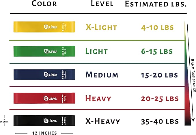 - WHAT YOU GET: A set of five color-coded and portable exercise band set with an instruction guide, carry bag, and an unlimited number of ways to bring more challenge to your workouts!