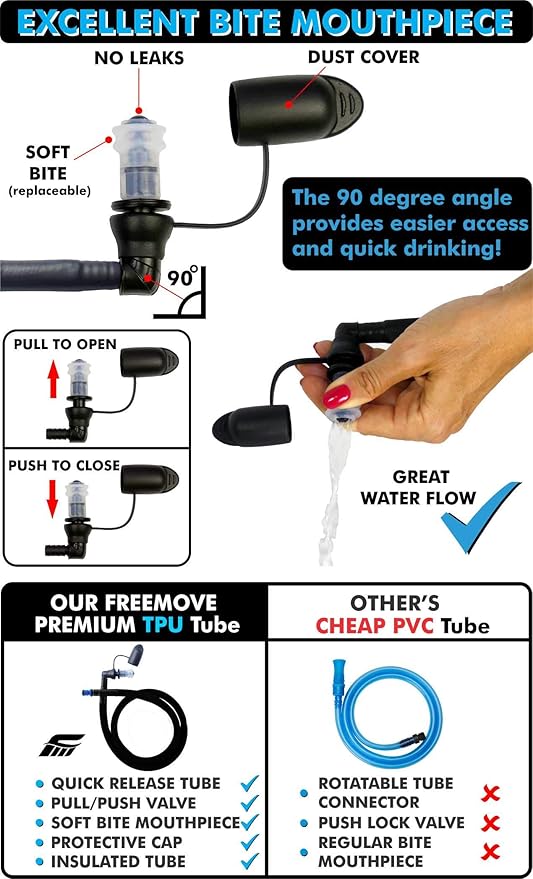 - The 2 liter hydration bladder ads no bad or plastic taste to the water and the large fill hole makes it very easy to clean, the insulated bladder tube has a soft mouthpiece with pull/push shut valve to prevent leaking, will prevent the water from overheating or freezing while hiking