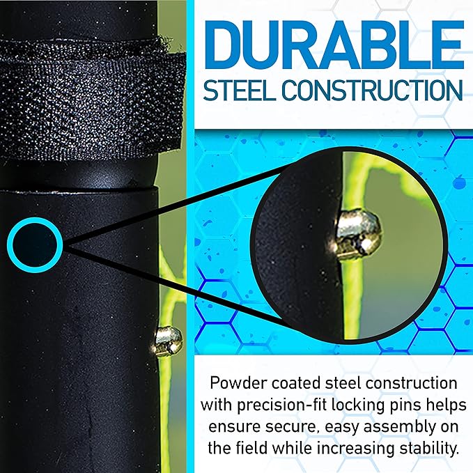 - DURABLE BLACK POWDER STEEL CONSTRUCTION: Powder coated steel construction with precision-fit locking pins helps ensure secure, easy assembly on the field while increasing stability.