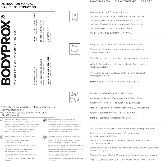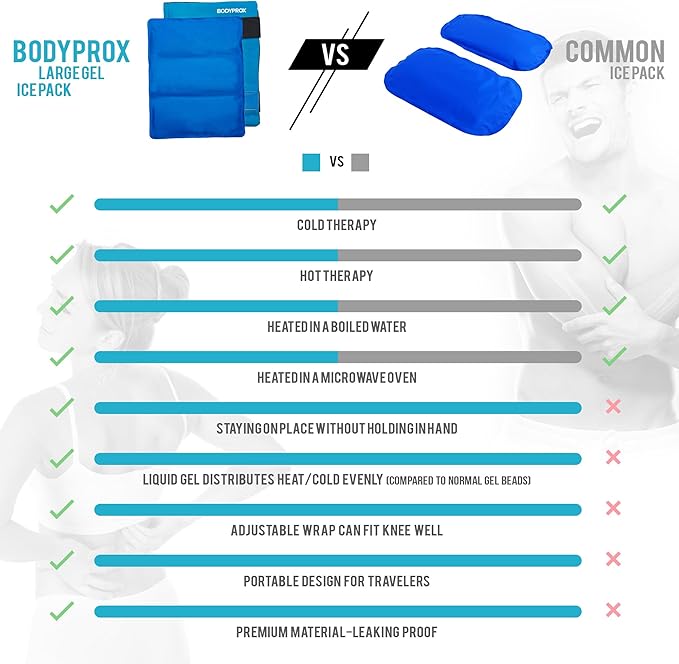 - Easily heated or cooled with gel that stays soft to mold to your body for the most effective relief. The Bodyprox Large Ice Pack uses a premium gel that stays hot or cold longer than traditional ice packs. Ice pack is approx. 11โ x 14โ in size, and the straps are elasticized for a universal fit.