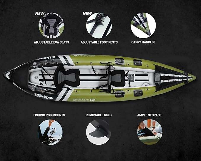 - INCLUDED - PVC inflatable fishing boat Kayak Fishing Boat, 2 x Lightweight Breakdown Kayak Paddles, Removable Skeg, Travel Bag with Backpack Straps, 2 x Padded High Back Support Adjustable EVA Seats, 2 x Drop-In Adjustable Foot Rest and a Dual Action High Volume / High Pressure Hand Air Pump.