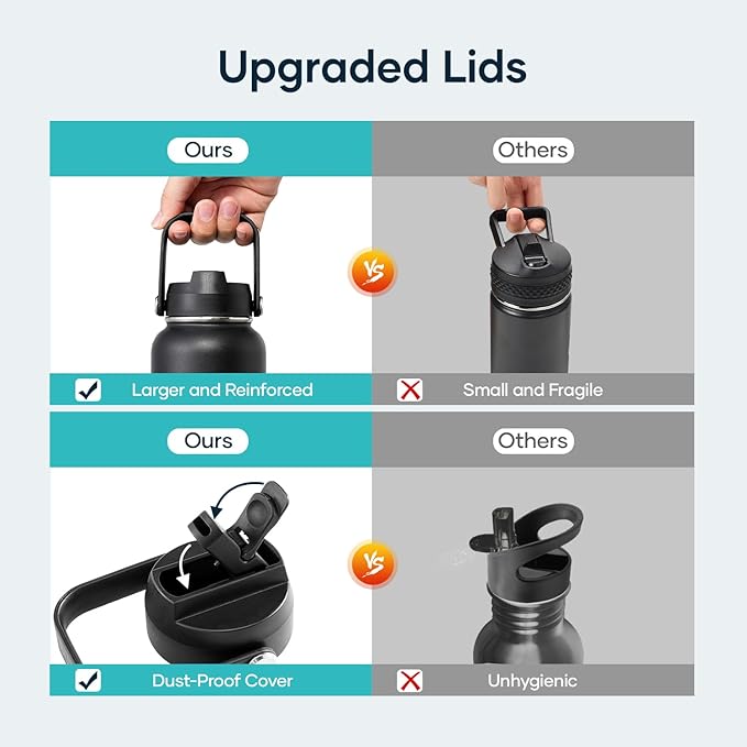 - 2 Caps Pack: This 32 oz stainless steel water bottle comes with straw lid and flex cap, the flex cap is perfect for the beach, camping and hiking, while the straw lid is suitable for cycling and road trip