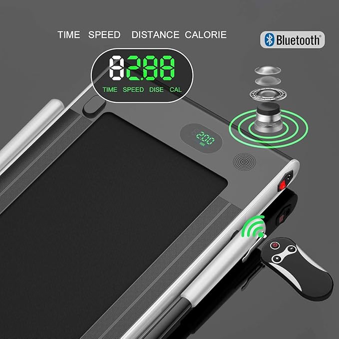 - WITH APP CONTROL, BLUETOOTH SPEAKER, PHONE HOLDER & REMOTE CONTROL — APP control is perfect to record exercise data. Connect the treadmill to your phone through Bluetooth, so you can play music while you are exercising. You can also use the phone holder to watch videos or chat with friends. The remote control (BATTERY NOT INCLUDED) is convenient to adjust the speed of movement and stop instantly. Equipped with a safety key to shut down immediately in an emergency to protect your safety.