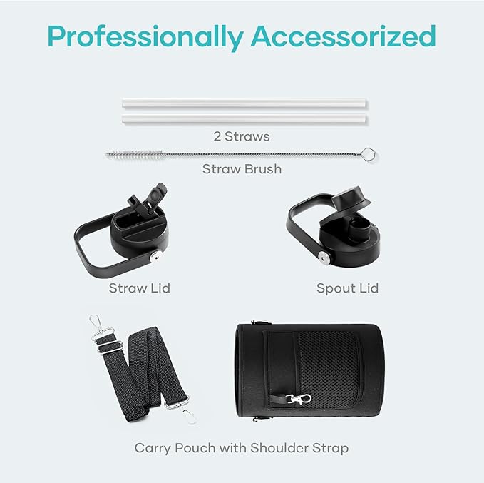 - What You Get: Included with a BUZIO insulated water bottle, a straw lid (2 straws), a flex cap, and a cleaning brush !