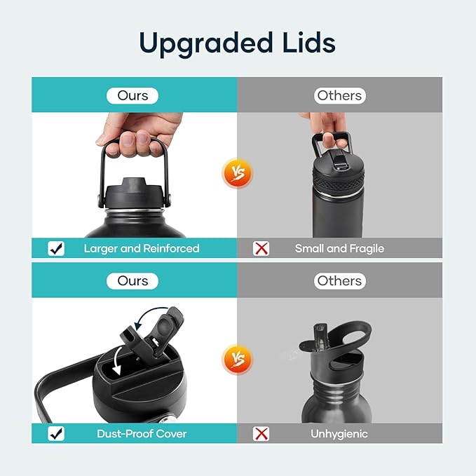 - 2 Lids to Max Its Usability: This half gallon stainless steel bottle comes with a straw lid and a flex cap to gear up your games and explorations. Both caps can seal airtight with 100% leak-proof, so you can drink without a spill on the road. *NOTE: ONLY the 22oz and 32oz T-shape bottles fit in any cup-holders*