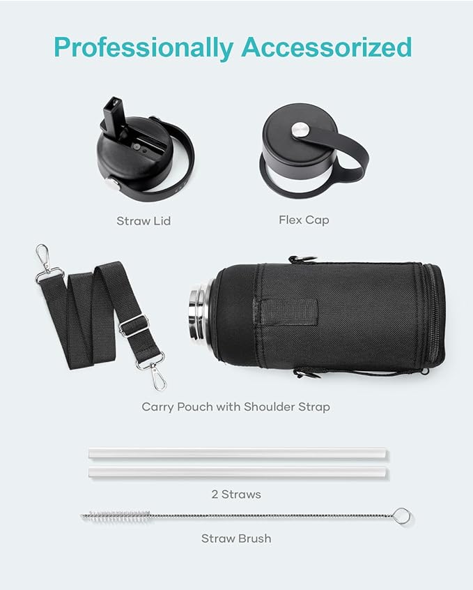 - What You Get: Included with a BUZIO insulated water bottle, a straw lid (2 straws), a flex cap, and a cleaning brush.