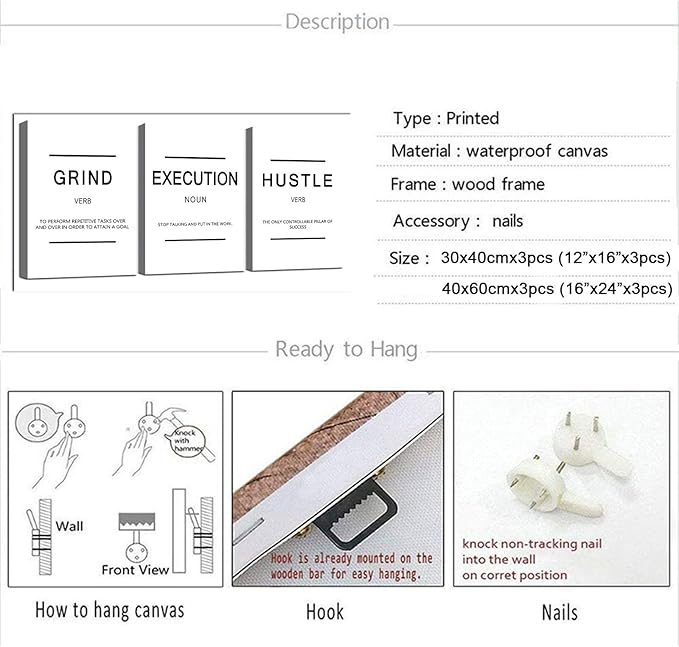 Inspirational Framed Canvas Wall Art - Grind Slogan, Success Quotes, Office Wall Art, Large Poster, Positive Motivational, Execute Poster (C-3pcs, 12x16in x3pcs)