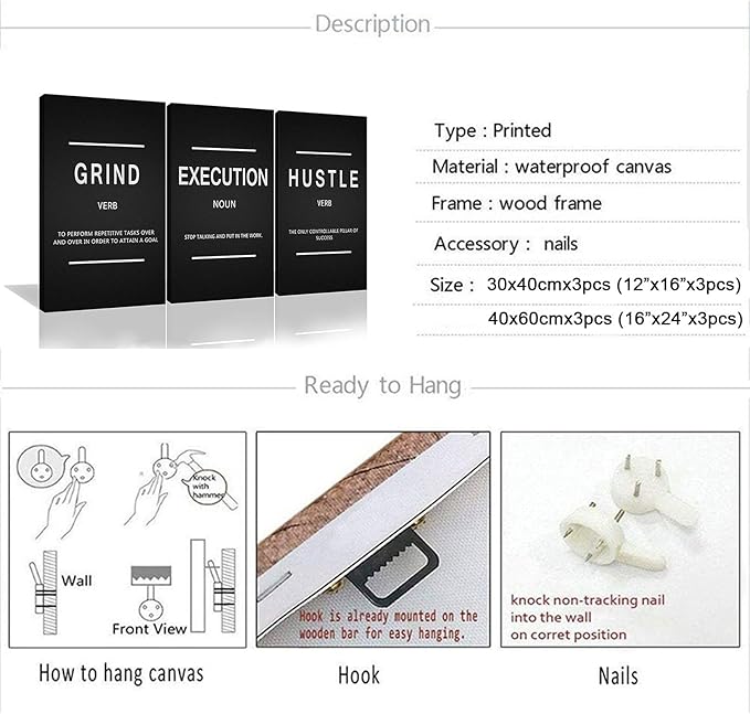 Framed Canvas Wall Art Success Quote, Office Wall Art, Black Large Poster, Positive Motivational Set of 3 Prints, Execute Failure Definition, Inspirational Print (B-3pcs,16x24inchx3pcs)