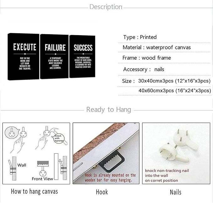 - 【Motivational Wall Art For Office】 The Size of the office canvas wall art set is: 12x16inchx3pcs (30x40cmx3pcs). The modern wall art prints perfectly combine quotes such as Execute, Failure, Success, making the artworks more inpirational and motivational. The inpirational wall art set is the best choice for home office gifts or boss office decoration.