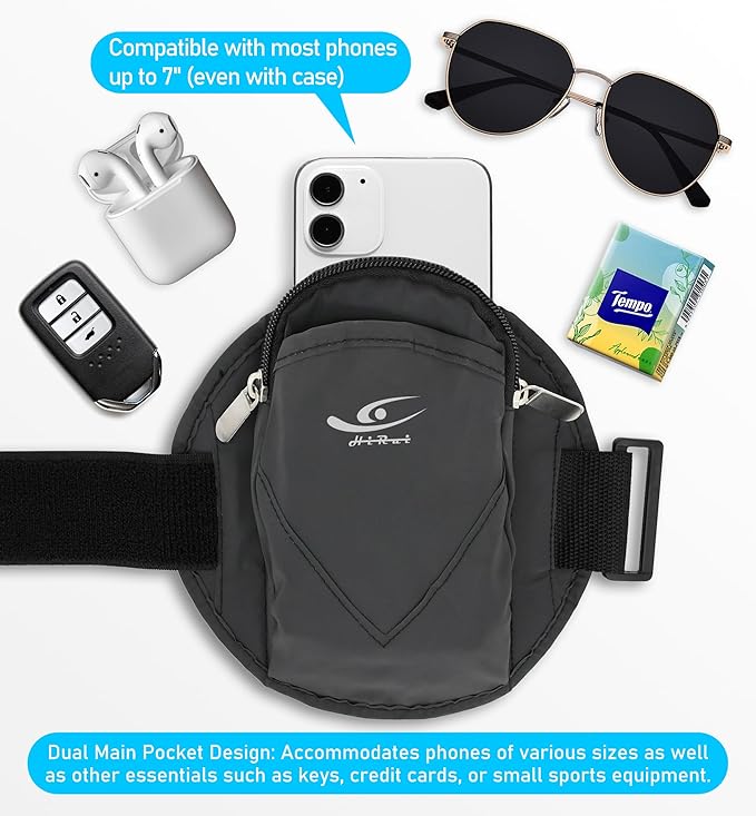 - All-in-One Storage Solution: Stay organized and hands-free with our upgraded sports armband! Featuring a dual-pocket design, it accommodates phones up to 7 inches (even with a case) and provides ample space for keys, credit cards, earphones, or other small essentials. Perfect for keeping your belongings secure and accessible during any activity.