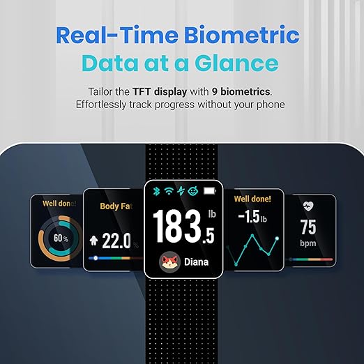 - πππ ππππππΌπΎππππ πΏπππππΌπ:Customized via the app and track up to 9 body metrics directly on the TFT display. This colorful screen lets you track progress and enjoy personalized, interactive messagesβall without needing your phone