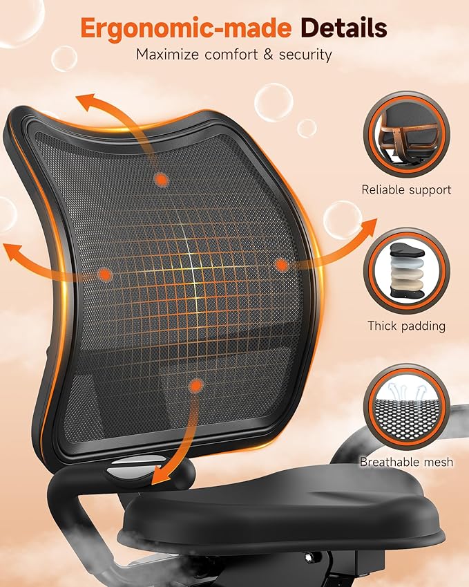• Ergonomic Seat & Backrest: Bid farewell to hip discomfort. Embrace comfort with ergonomic high-density soft sponge cushion and breathable mesh backrest; 8 seat position is easy to adjust, providing ample leg room for user height up to 6'3"