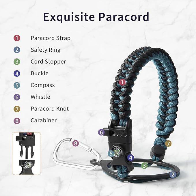 - Full-function Paracord Handle: Brilliant paracord of matching colors bring out the bottle with a touch of youthful vibe. Compact compass and handy carabiner make the bottle the ideal survival kit for expeditions in the wild.
