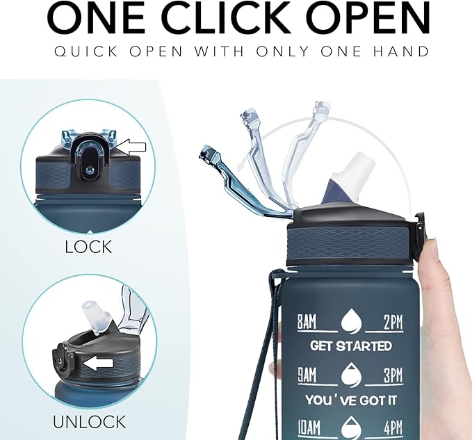 - Functional Design: The bottle with straw allows for spill-proof sipping; The flip-top lid has a secure lock leak and can be opened easily with one hand; The wide mouth fits ice and is easy to clean.
