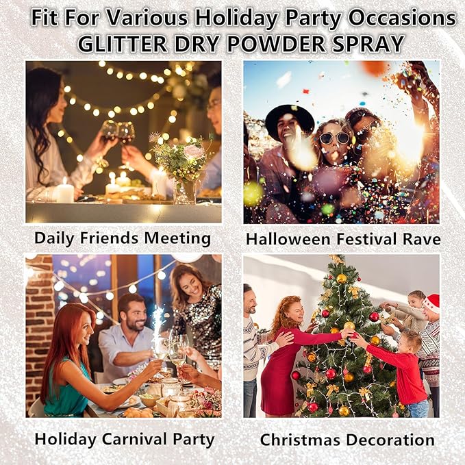 - 【Perfect for Party Festival Body Face Highlighter】Perfect for masquerade club, rave, festival, birthday.The stunning glitter makes you stand out in themed parties, masquerade and all kinds of festive carnival occasions, adding more charm and beauty to you. Glitter Powder Spray for Christmas Decorations and so on.