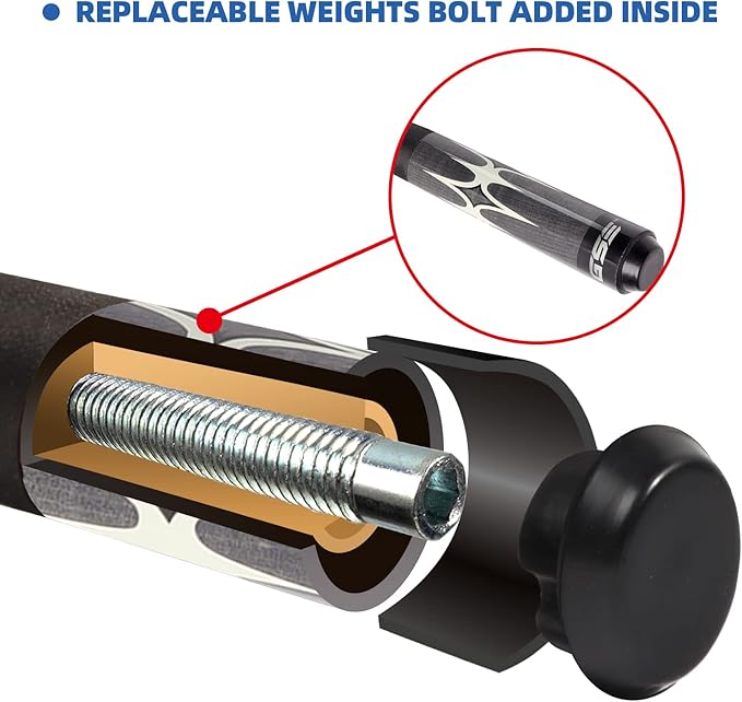 - Design: 12 mm glued on multi-layer leather tip with 0.5" quality fiber ferrule; 3/8-10 stainless steel quick release joint technology; pressed solid black nylon line wrap and black butt cap, the butt has a black rubber bumper that is more resistant to falling