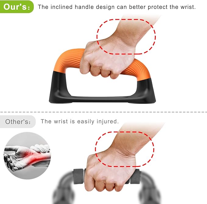 - đăComfortable and Secure GripăOur push up bars feature thickened soft plastic handles that provide a comfortable and ergonomic grip. The handle has a textured surface that prevents slipping and enhances stability. The handle is also angled to allow a natural range of motion and prevent injury
