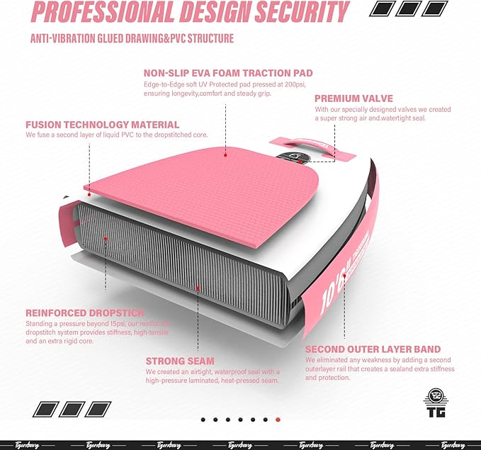 - 【Lighter and More Flexible】The TIGERXBANG Defender Collection inflatable paddle board is made of ultra-light military-grade PVC material, which has excellent wear resistance, toughness, and a long service life. With a size of 10' x 31" x 6", the paddle board is lighter, more portable, and easier to operate, allowing paddlers to navigate various complex water flow environments with more flexibility.
