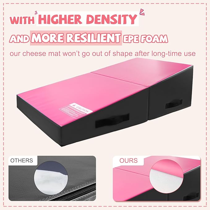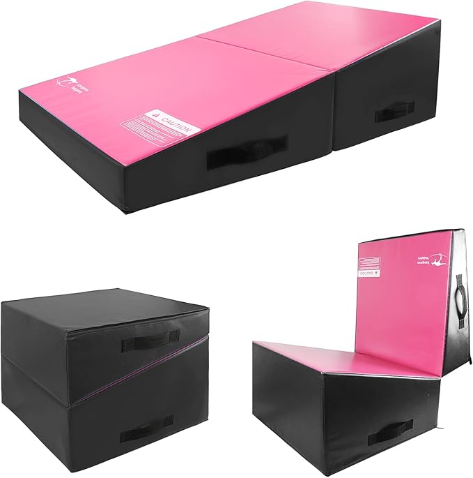 - FOLDABLE DESIGN WITH 4 HANDLES, EASY TO CARRY & STORE: Each side and every handle with excellent craftsmanship will never unravel. Simply turn the gymnastics mat from a cube to a wedge or from a wedge to a cube by opening and folding it. You can take the incline mat with you to the backyard, park, or gym and store it at any place in your house when not in use.