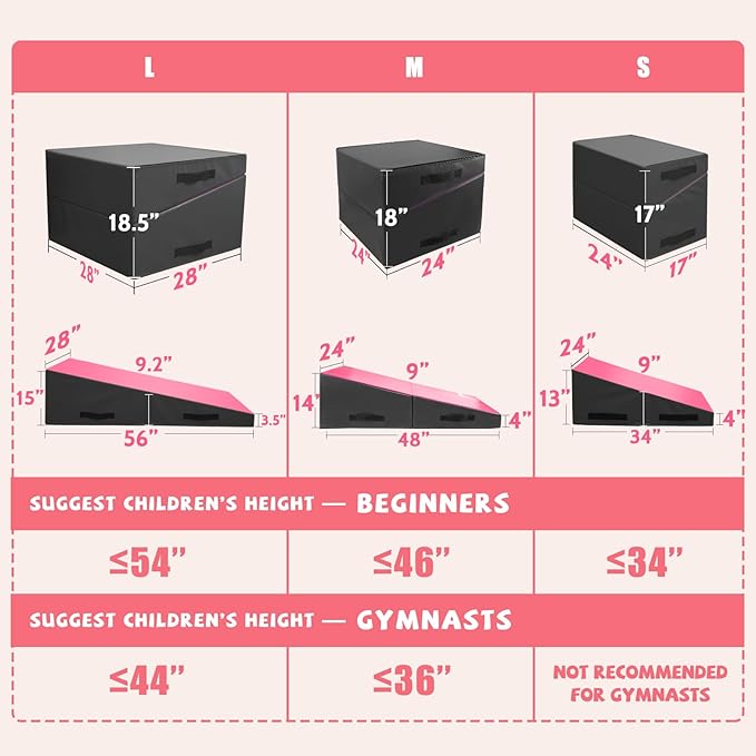 - COMFORTABLE & FIRM STUFFING BRINGS ETERNAL SECURITY: Kangaroo Hoppers cheese mat is dedicated to safety. Folded size of L: 28"x28"x18.5"(L x W x H). Unfolded size 56"x28"x15" (L x W x H). Suggested children’s height is shorter than 54". Suitable for young gymnasts and allows for a variety of skills training. You feel stable and comfortable on this gymnastics wedge mat. And high-density EPE cottonfoam won’t go out of shape after long-time use.