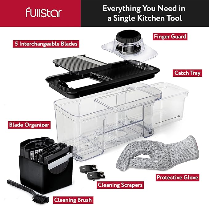 - Extra Handheld Spiralizer - Compact and easy to use, the Fullstar mandoline slicer comes with a 3 in 1 adjustable spiralizer. Unlike large units, this kitchen gadget is easy to store and a breeze to clean as it is dishwasher-safe.