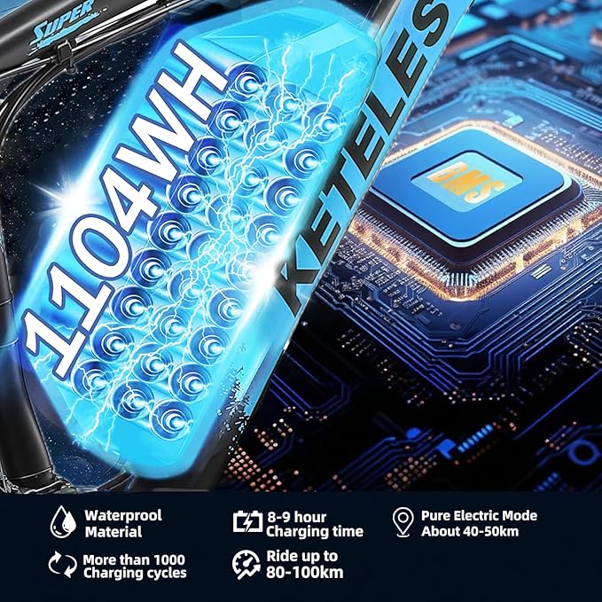 - 【High-Performance Battery】: The K800 bike is equipped with a high-capacity removable 48V 23AH battery with a total capacity of 1104WH. Depending on the load and terrain, the range in pure electric mode can reach about 40-50Km, and the range in electric assist mode can reach about 80-100Km. Our adult electric mountain bike is equipped with a 7-9 hour fast charging system and a meter that displays real-time battery power, allowing you to get on the road quickly, perfect for long-distance riding