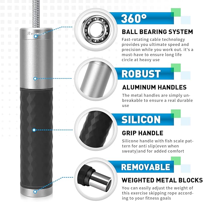 - Our upgraded 360 degree spin high-speed ball bearing system is placed inside the handles to ensure that the weighted jump rope is tangle-free, fast, and smooth. It's a must-have for heavy use, and will ensure a long life cycle.