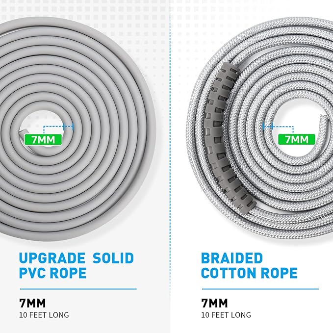 - We've added a wear-resistant silicone protective tube to our 7mm braided cotton rope, which weighs 0.2LB and is 10 feet long. And if you need a more wear-resistant option, our 7mm solid PVC rope weighs 0.28LB and is also 10 feet long. Both options require a perfect combination of speed and strength when using.