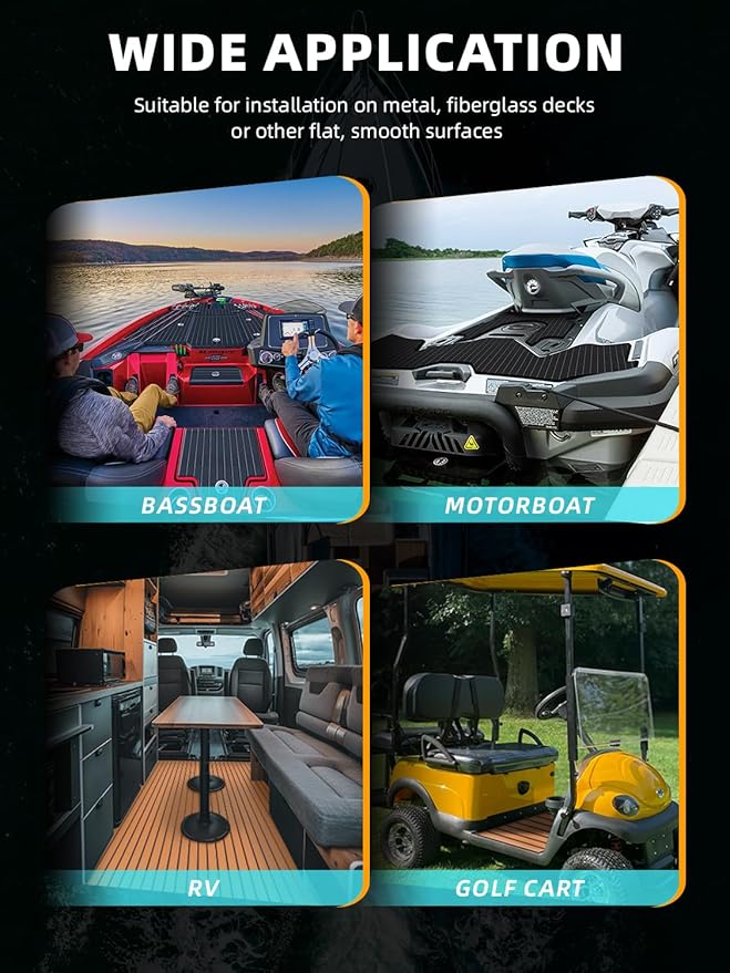 - Wide Application - Very nice faux teak boat flooring, different colorful patterns available. They are perfectly used for Motorboat, Jon Boat, RV Yacht Kayak, Surfboard, Swimming Pool, Garden flooring and other boat decking
