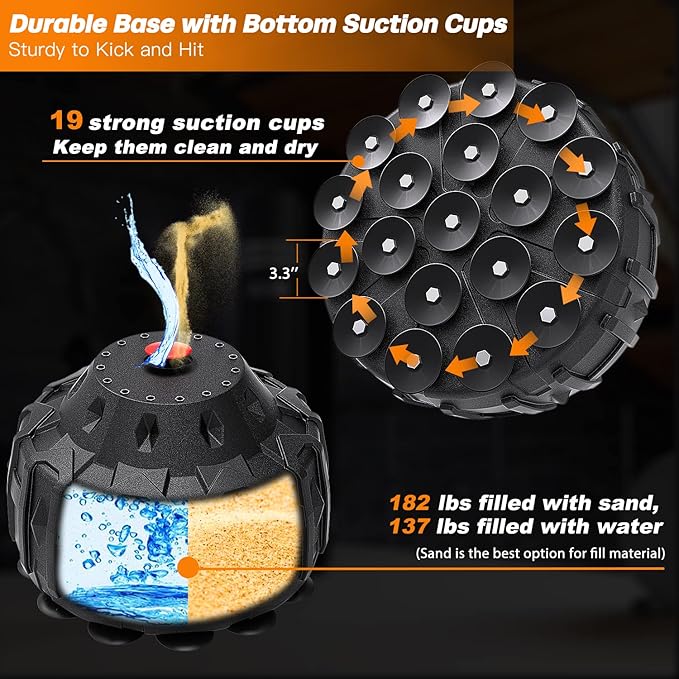 - Stable Floor Sucking Base: Double layer base is about 11.8 inch high, can be filled with more sand, together with 19 suction cups, increasing suction power in order to avoid instability. Weights about 182lbs filled with sand, 137lbs with water approx. To avoid water leakage, please do not use suction cups when filled with water. Sand is HIGHLY recommended(sand is not included)