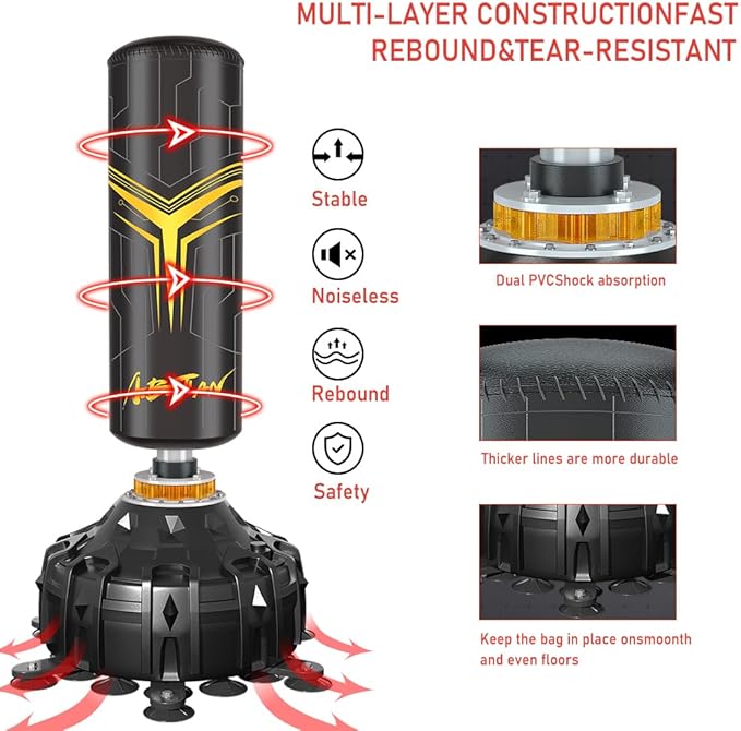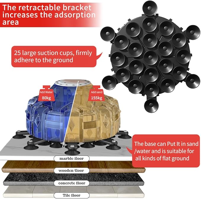 - 【Ultra Stable Base】Large size and non-deformable movable polypropylene base, which can hold 130lb of water or 200lb of sand, there are also 25 pcs suction cups, to provide stable support for the entire boxing bag. Sand is the better option to make it more stable.