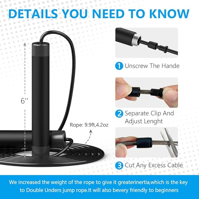 - 【WEIGHTDE ROPE JUMPS PERFECTLY】 We use a 5.0mm steel wire rope, which weighs an astonishing 4.2oz and is the foundation of high-quality jumping,Whether you're a boxer, a regular trainer for cardio, crossfit, or just jump for weight loss, this is the perfect beginner's weighted jump rope.
