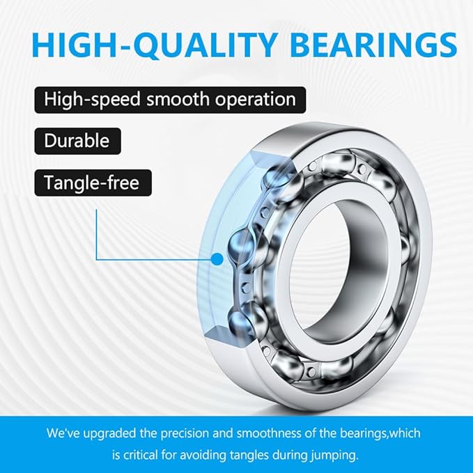 - 【POWERFUL BEARINGS REFUSE TO INTERTWINED】 The handle is equipped with high-speed ball bearings to ensure smooth and rapid rotation, effectively avoiding rope entanglement. The powerful bearings can make cross jump, double jump and other fancy jump ropes easier.
