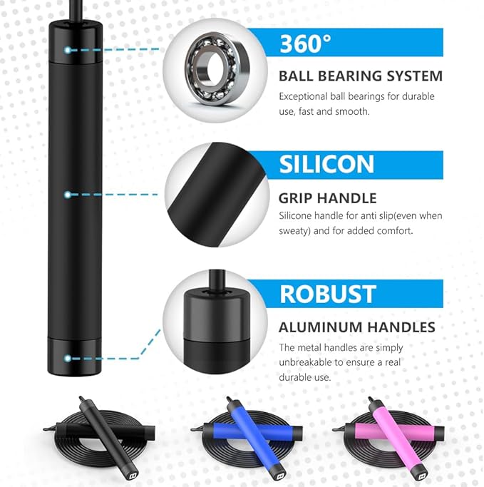 - 【ROBUST AND COMFY HANDLES】 Using metal handle jump ropes for workout,ensure a real durable use. The silicone covers on the handles give you a solid grip even at sweating.Comfortable grip makes it easier for you to jump