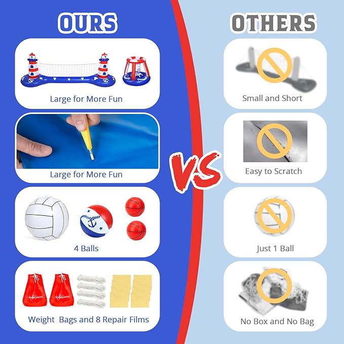 - 【Versatile Pool Games Set】- This inflatable pool toys set includes a volleyball net (110" x 26" x38 "), a basketball hoop (18.4" x26"x24"), 2 Basketballs( 6.5"), 2 water beach volleyballs(20" & 12"),2 weight Bags, a basketball Inflator, 4 Ropes, 8 Repair Patches, providing endless fun for toddler kids and adults during summer pool parties and outdoor activities.