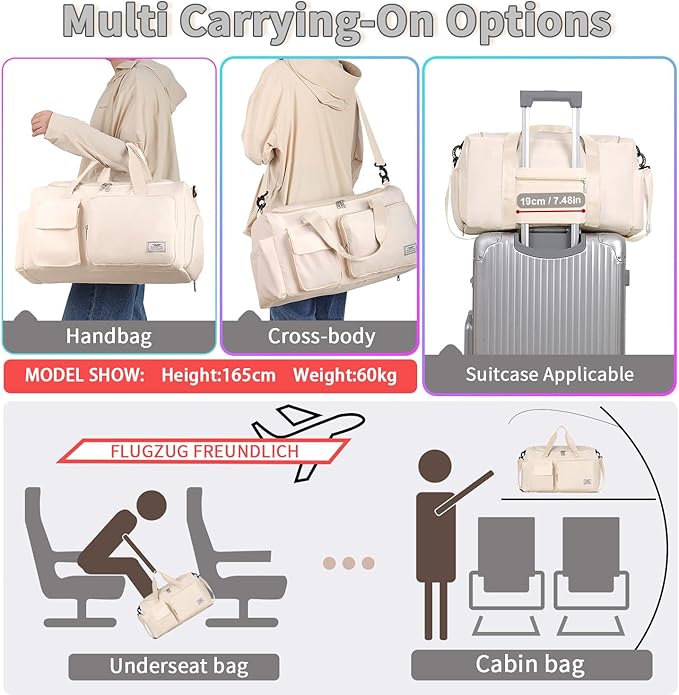 - : The size of this travel bag is 18''×11''×11'', ideal as a carry on bag. With additional adjustable shoulder strap & integrated trolley sleeve, the tote bag can be carried with you everywhere, making your travel a breeze