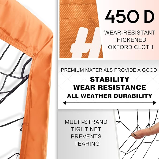 - 【Long-lasting Thickened Material】 The soccer goal is made of 450D thickened oxford cloth, 12mm high elastic fiberglass pole and strong 3-layer polyester soccer net. This ensures exceptional performance even against powerful shots, maintaining its all-weather durability and it won't fade or wear even if it is placed outdoor for a long time.