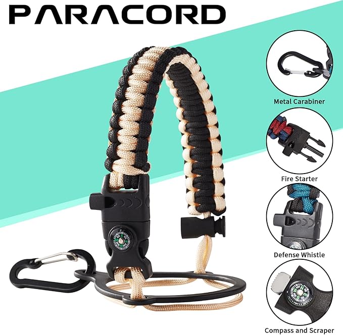 - UNIQUE PARACORD HANDLE: Bright color paracord matches the flask water bottle to give you a youthful vibe while adding a personal style. With a compass, safety loop, metal carabiner, flint, igniter and whistle to become your survival tool, making the 32 oz stainless steel water bottle with paracord an ideal survival kit for expeditions in the wild