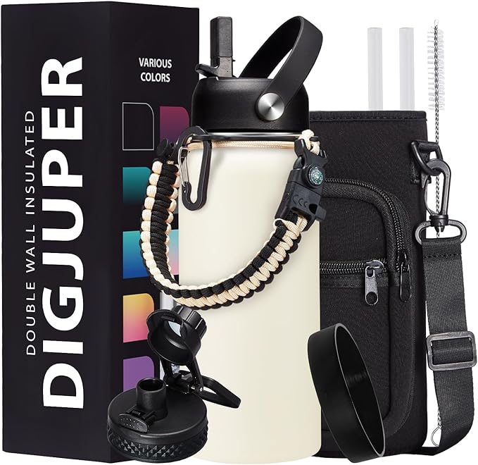 - SUPER JOYFUL COMBO: Buy 32oz insulated water bottles and get 9 accessories (2 x lids, 1 x survival paracord, 1 x carrying pouch, 1 x shoulder strap, 1 x protective cup mat, 2 x straws, 1 x straw brush). WITH A LIFETIME GUARANTEE, these thermal water bottles are perfect gifts for using at home, work, school, road trips, hiking, sporting events, or just hanging out
