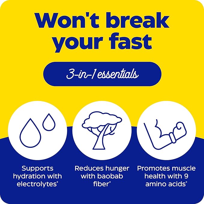 - 3-in-1 Ultimate Drink Mix for Intermittent Fasting: Packed with hydrating electrolytes, baobob fiber for appetite control, & 9 essential amino acids to promote muscle health.*