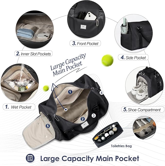 FIORETTO Womens Gym Tote Duffle Bag with Toiletry Bag, Sports Duffel Overnight Hospital Workout Carry on Bag for Girls with Wet Pocket & Shoe Compartment, Ideal for Travel, Swimming, Dance Black