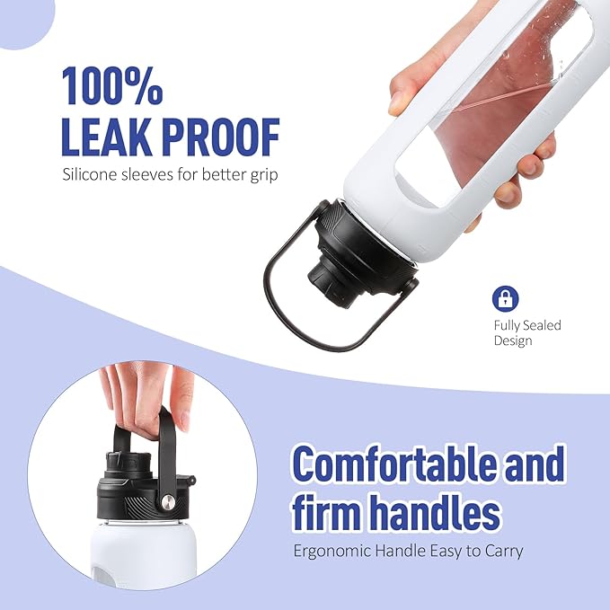- WHAT YOU'LL GET - Our daily water intake bottle set comes with a water bottle covered with a silicone protective sleeve, 1 bamboo lid plus 1 spout lid with handle, 2 straws(1 stainless steel and 1 tritan), and 1 straw cleaning brush. You can switch between the two lids according to the occasion and preferences. If there is any problem with your water bottle glass or the lid is damaged within 6 months, you can contact us at any time for a replacement.