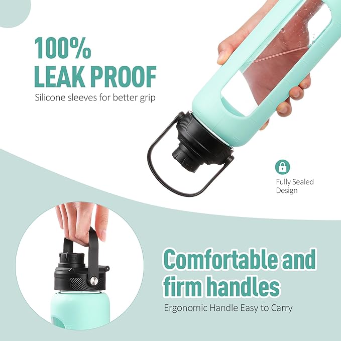 - DUAL LID WATER BOTTLE - Our glass water bottle is equipped with 2 lids, offering a range of options for drinking and transport. The bamboo straw lid makes sipping more effortless, allowing for easy hydration throughout the day whether you're at the home, office, gym, or outdoor activities. The leak-proof spout lid is designed for those who prefer a more traditional drinking habit. The spout enables smooth liquid flow and the handle attached to the lid allows for easy carrying on the go.