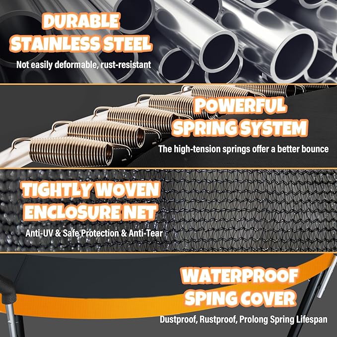 - 【Gapless & Tightly-woven Enclosure】To improve safety and longevity, the 12-foot trampoline is designed without gaps, reducing the the risk of accidental injuries, ensuring a consistent and enjoyable bouncing experience. The enclosure is crafted from tightly-woven polyethylene, offering robust UV protection.