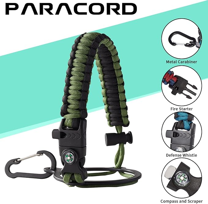 - UNIQUE PARACORD HANDLE: Bright color paracord matches the flask water bottle to give you a youthful vibe while adding a personal style. With a compass, safety loop, metal carabiner, flint, igniter and whistle to become your survival tool, making the 32 oz stainless steel water bottle with paracord an ideal survival kit for expeditions in the wild