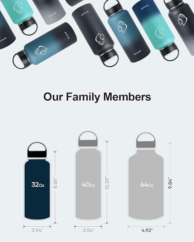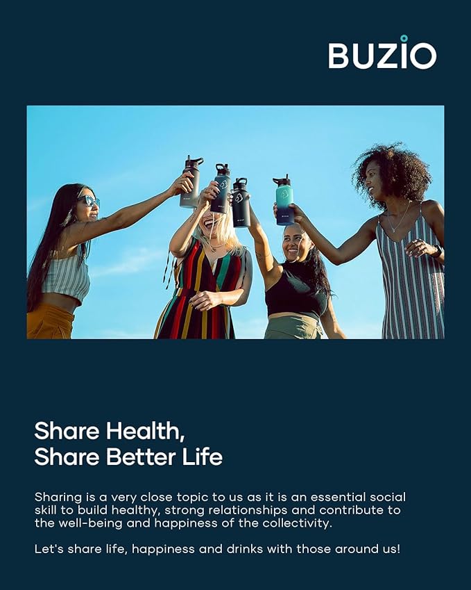 - There is Always One for you: BUZIO insulated water bottle meets your imagination in all aspects of drinking, from the comprehensive sizes (32oz-64oz) to classical and stylish designs, from the production materials to convenient accessories. Come to BUZIO, there is always one for you.