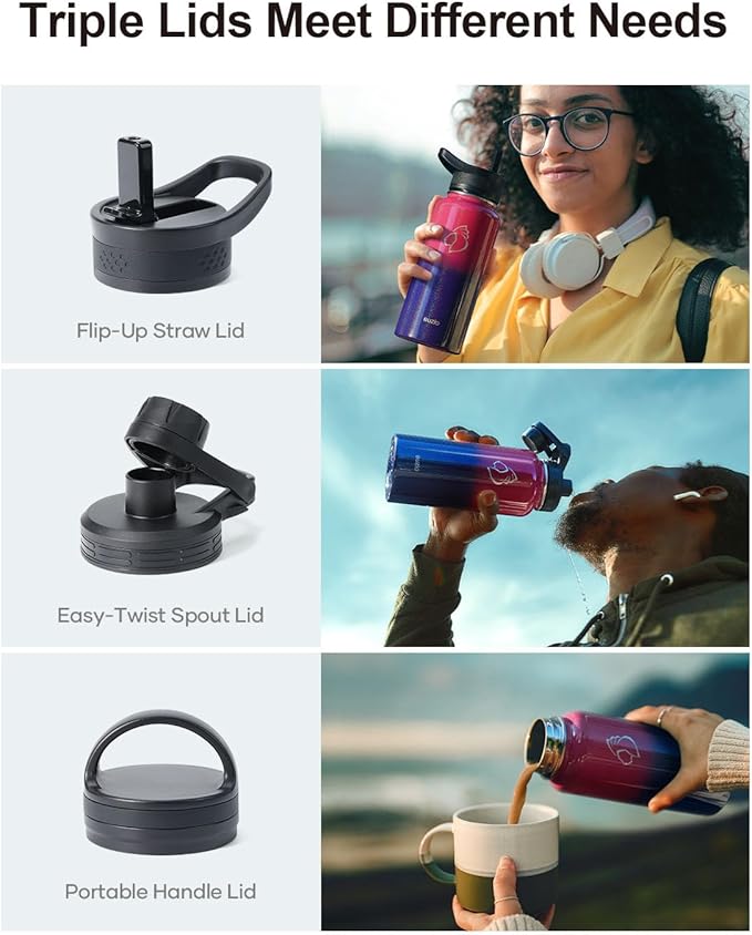 - 3 Caps Pack, 100% Leak-Proof: BUZIO stainless steel water bottle comes with 3 lids: portable handle lid, easy-twist spout lid, and flip-up straw lid to meet camping, hiking, cycling, fitness sports and more. Each lid has a thickened 360° seal for 100% leak-proof.