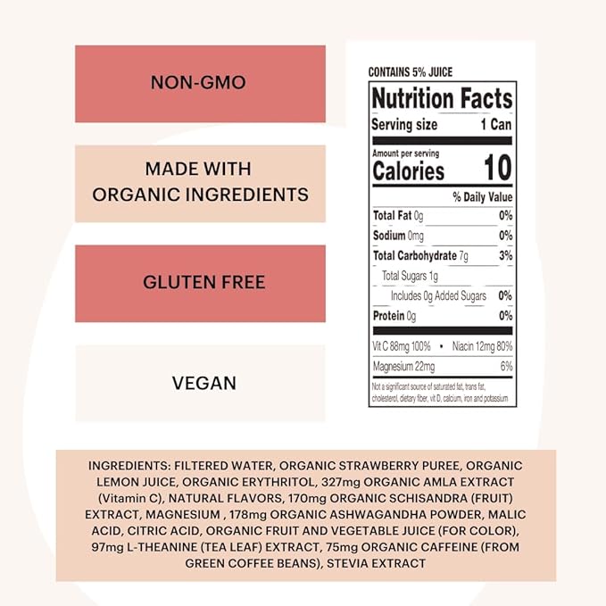 - ENERGY VARIETY PACK: Try several of our most popular flavors, each with 75 MGs of organic caffeine (like a small cup of coffee). Energy + Focus sparkling strawberry lemon helps sustain energy and concentration with L-theanine and Ashwagandha. Energy + Lift Cherry Limeade helps support mood with Ashwagandha and Ginseng, and NEW Energy + Hydrate Lemon Fizz helps support hydration with natural electrolytes like magnesium, potassium and pink Himalayan Sea Salt.